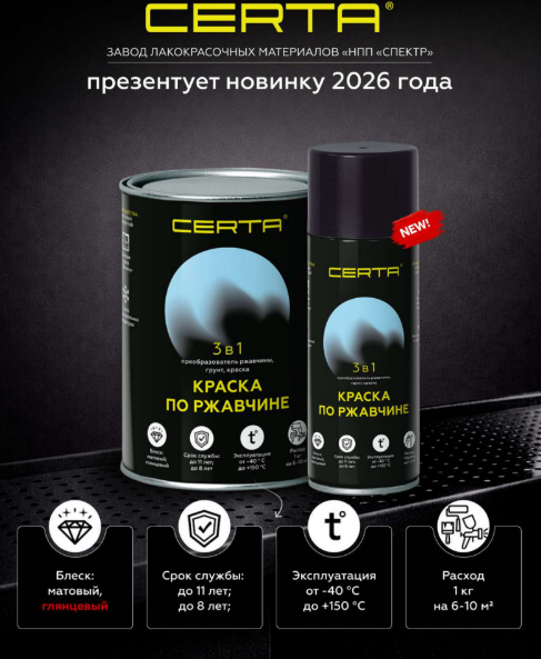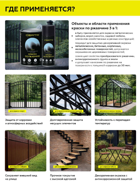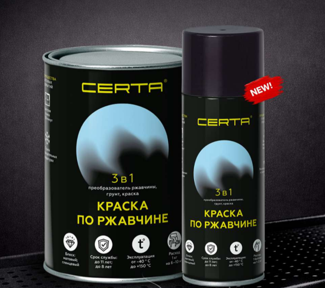 Если нужна краска по ржавчине, которая экономит время и даёт стабильный результат, выбирают материалы формата 3 в 1. CERTA 3 в 1 — это решение, где в одном продукте объединены преобразователь ржавчины + грунт + финишная краска. Состав подходит для ремонта и защиты конструкций, когда важно наносить покрытие быстро, надёжно и без лишних технологических операций.