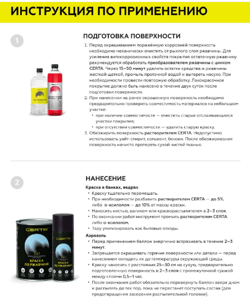 - Усиление антикоррозионной защиты (рекомендация). Остаточную ржавчину рекомендуется обработать преобразователем ржавчины с цинком CERTA. Спустя 15–50 минут удалить остатки средства и ржавчины жёсткой щёткой, промыть водой и вытереть насухо. При необходимости обработку повторить. Окраску рекомендуется выполнить в течение 2 суток после подготовки.