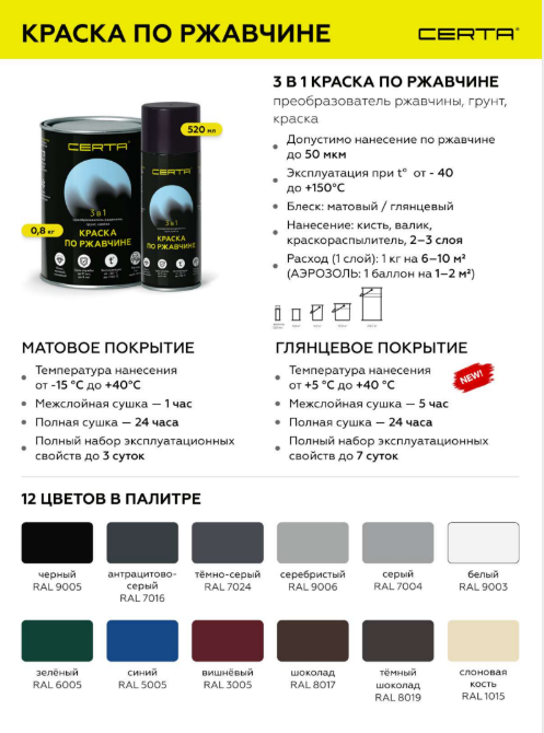 CERTA 3 в 1 краска по ржавчине работает как комплексная система: она помогает подготовить основание, улучшает сцепление с поверхностью и формирует финишный защитный слой. Материал выпускается в вариантах матовое и глянцевое исполнение.