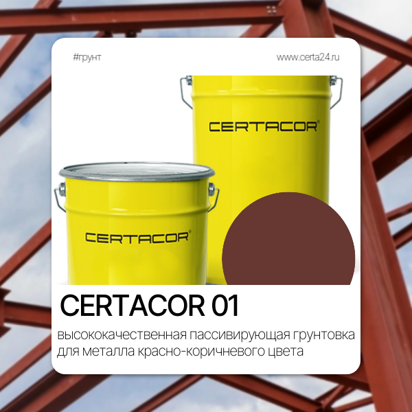 CERTACOR 01 — высококачественная пассивирующая грунтовка красно-коричневого цвета на основе модифицированных полиорганосилоксанов, содержащая противокоррозионные пигменты и ингибиторы коррозии. Эта certacor краска обеспечивает двойной механизм защиты: изолирующее (барьерное) действие и пассивацию металла.
