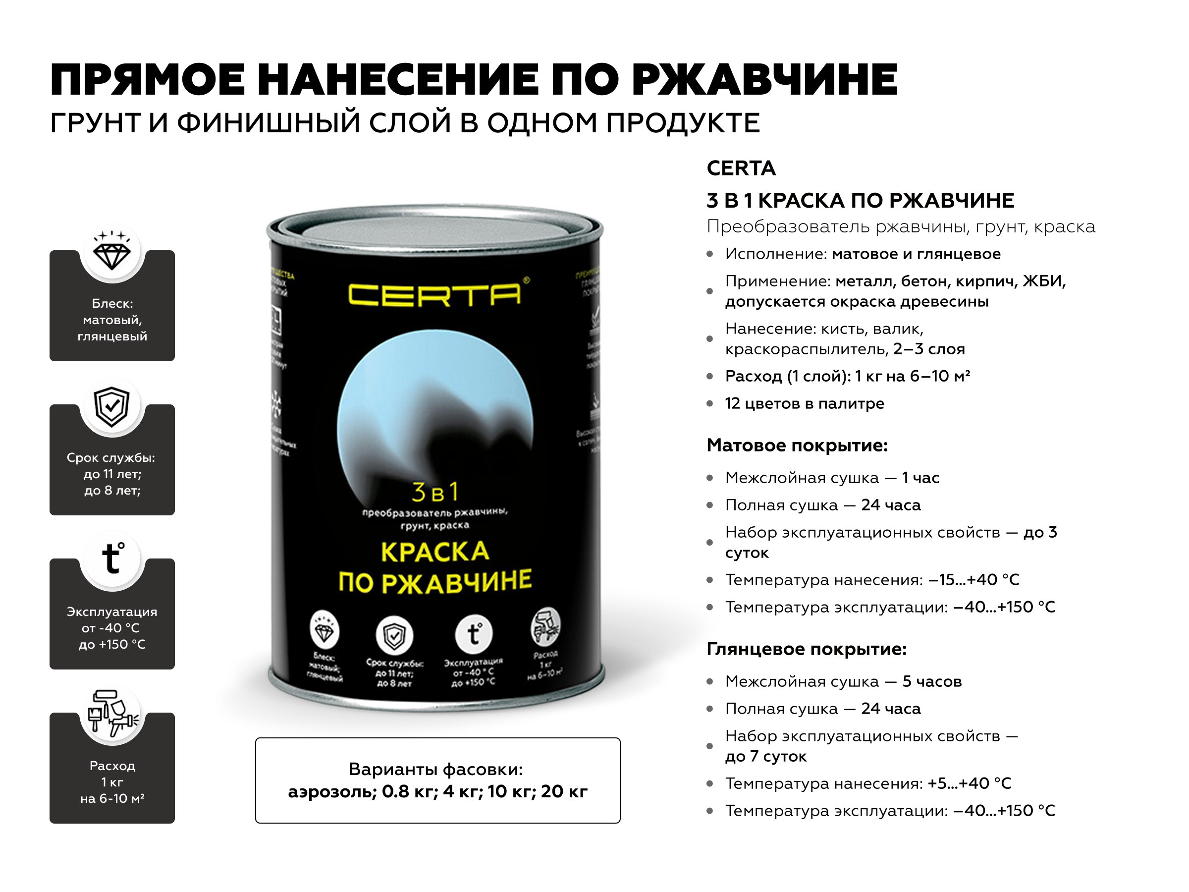 - Формула 4 в 1: преобразователь ржавчины, грунт, эмаль, гидрофобный воск.