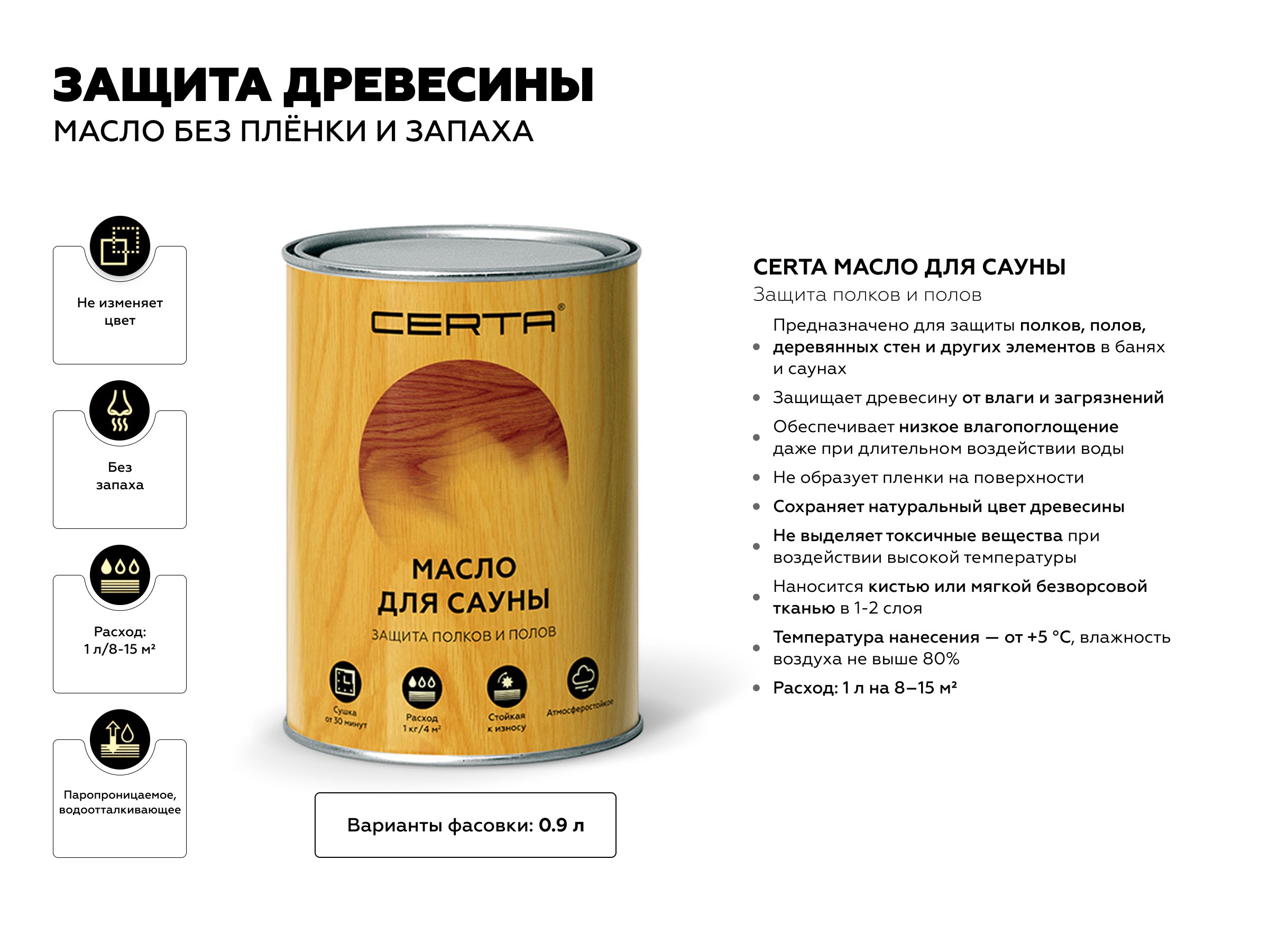 В трендах 2026 года — экологичная и комфортная защита древесины, особенно в банях и саунах. CERTA масло для сауны предназначено для защиты полков и полов и не образует плёнку на поверхности.