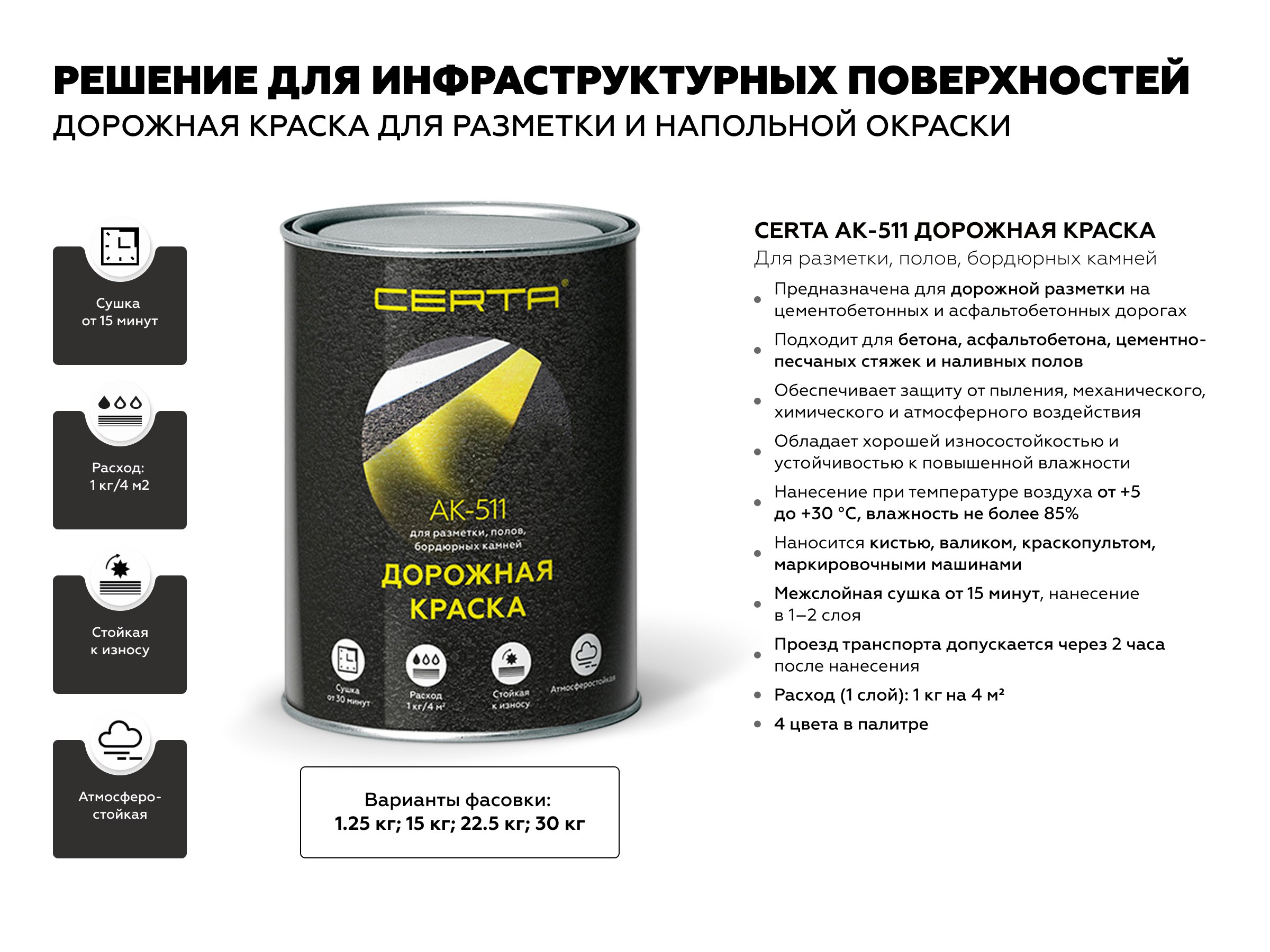 Для инфраструктурных задач и объектов с высокой нагрузкой в 2026 году особенно актуальна дорожная краска для разметки и напольной окраски. CERTA AK-511 разработана для работ по цементобетонным и асфальтобетонным основаниям.