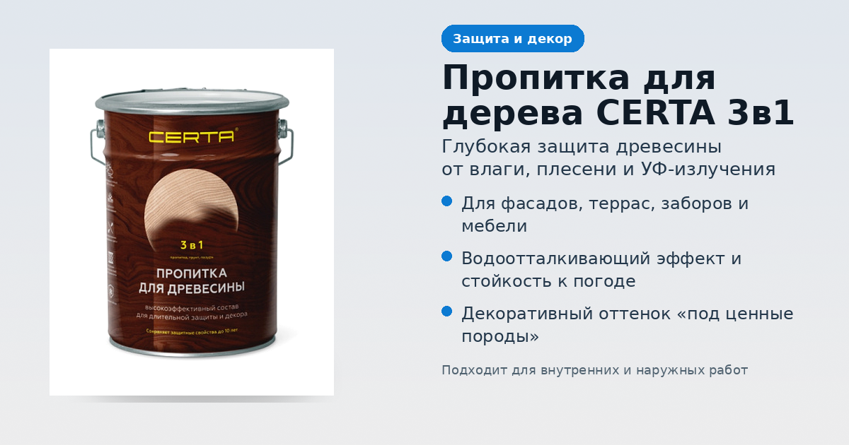 Сегодня существуют специальные лаки и пропитки, способные обеспечить полноценную защиту древесины. Один из таких примеров — пропитка для древесины 3 в 1 Certa, сочетающая одновременно грунт, защитную пропитку и декоративное покрытие.
