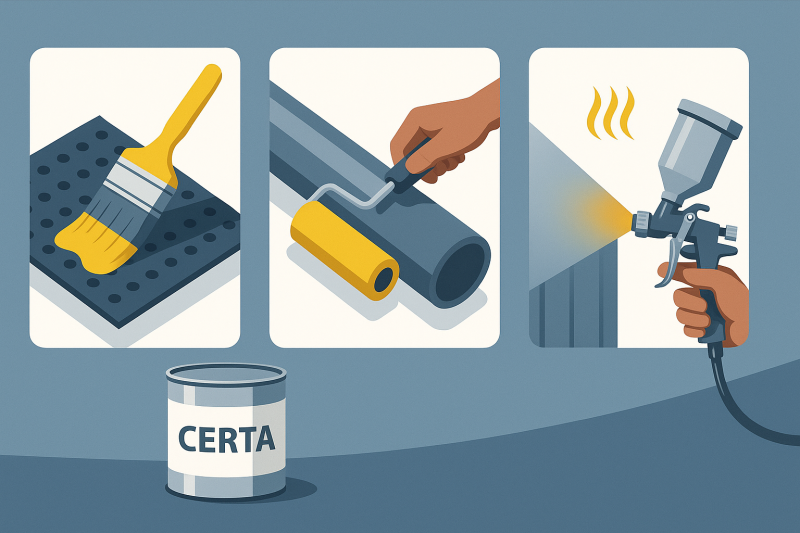 При окрашивании металлических поверхностей термостойкими красками Certa важно не только правильно подготовить основание, но и выбрать оптимальный инструмент для нанесения. От этого напрямую зависит равномерность слоя, расход краски и конечное качество покрытия. Рассмотрим подробнее преимущества и особенности каждого способа.
